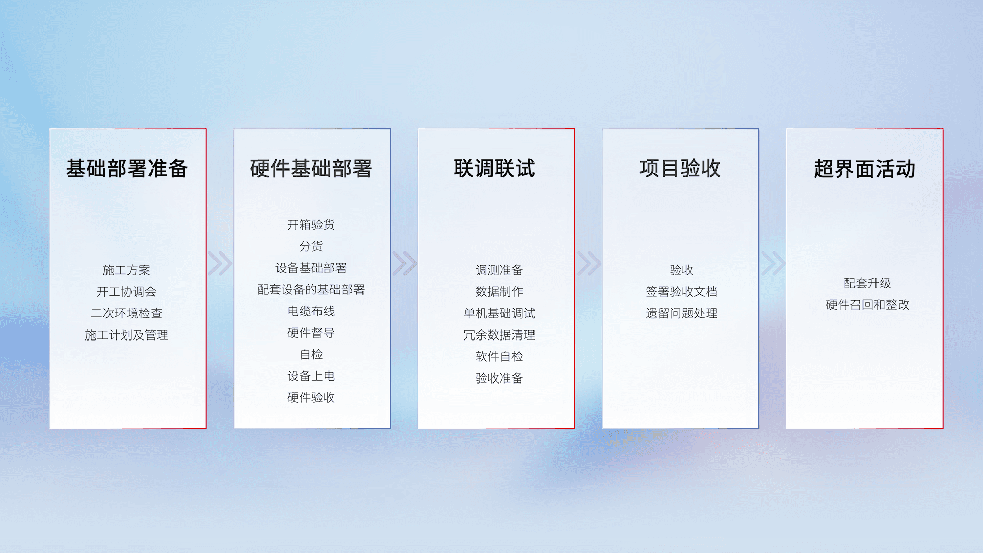 从基础部署准备、、硬件基础部署、、、、联调联试、、、项目验收、、越界面活动的全过程可追溯,,,保证施工质量和进度。。。